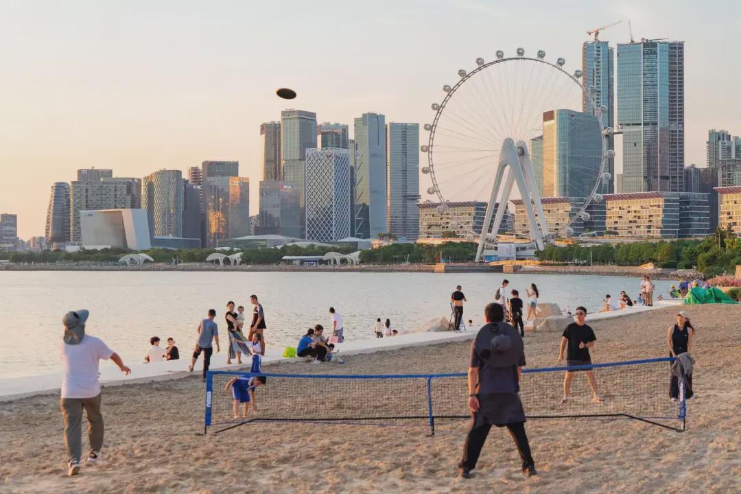 都市人工沙池总面积约3600平方米,不仅成为了年轻人和孩子们嬉戏玩沙的乐园,还能举办沙滩排球、沙滩音乐节、沙滩观影等公共活动,人工沙池配以约480米长的砾石岸线,市民游客可在此近距离接触滨水景观。