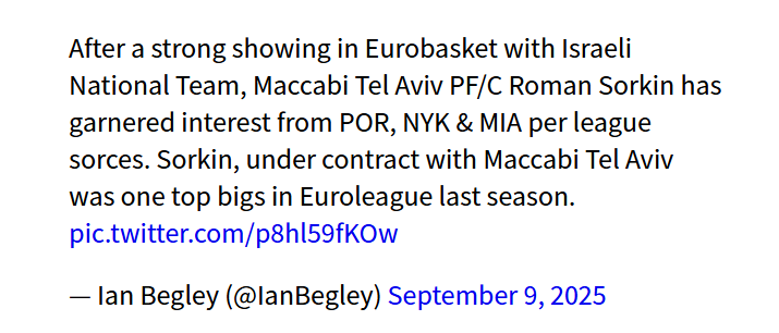 据NBA记者Begley报道,联盟消息人士透露,在代表以色列国家队参加男篮欧洲杯有出色表现后,特拉维夫马卡比队的中锋索金已经引起了开拓者队、尼克斯队和热火队的兴趣。索金与特拉维夫马卡比队有合同在身,他上赛季是欧洲联赛中的顶级内线球员之一。