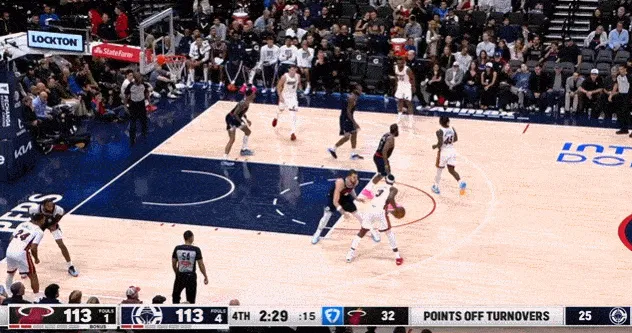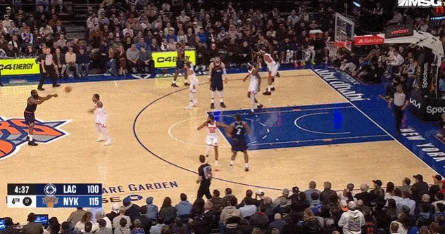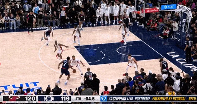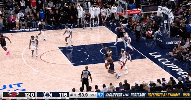 这一回合发生在第三节剩下5分半之前,当时伦纳德绕与大洛佩斯挡拆,面对米罗防守,运球到底线附近出手中距离,球是进了,但是伦纳德在后退过程里被场边球迷不小心垫到,回防跑动时明显不太对劲。