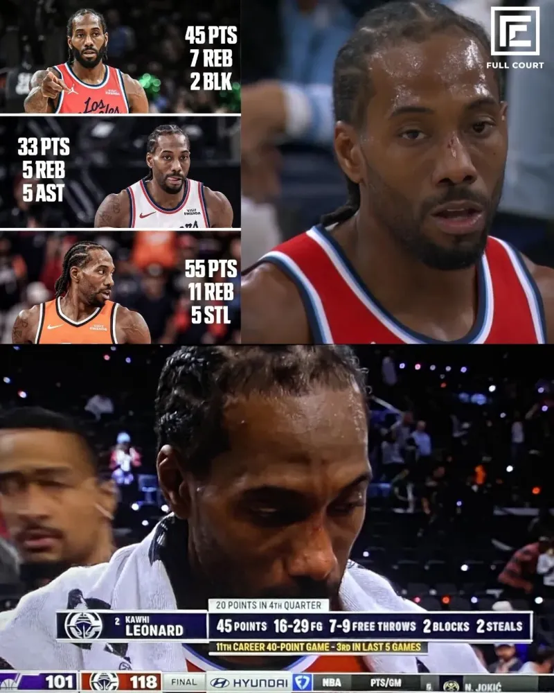 值得一提的是,伦纳德的进攻状态是随着赛季深入越来越好,过去的9场比赛,他有3场拿下40+(生涯至今也就11场40+),分别是: