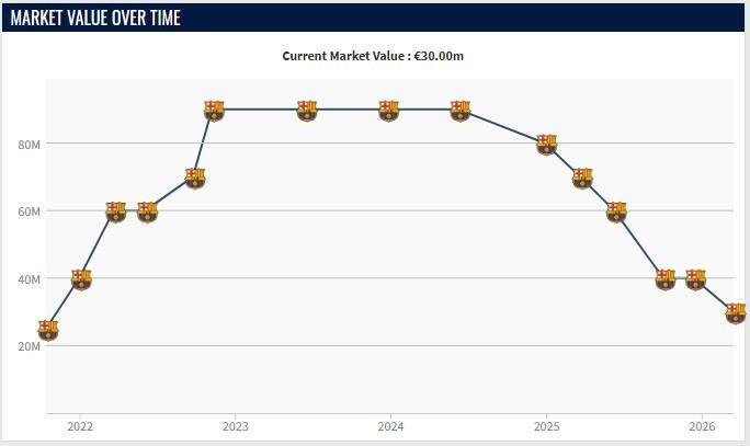 加维的巅峰身价是2022年11月到2024年6月的9000万欧元,但由于23-24赛季开始遭遇伤病问题,他的身价开始下跌,本赛季他同样受到了伤病的影响,因此身价下跌到了3000万欧元,仅为巅峰身价的1/3。